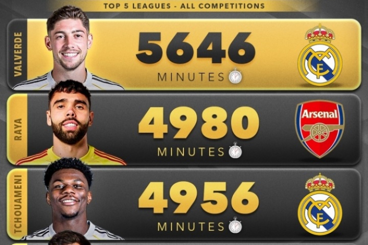 体育资讯07月16日讯 随着世俱杯的结束,2024/25赛季也划上了句号。外媒score90统计了本赛季五大联赛球员在俱乐部的出场时间,巴尔韦德以5646分钟断层排名第一,第二是阿森纳门将拉亚。