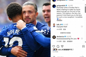 本场比赛埃弗顿新援格拉利什首发出战送出两次助攻,赛后也当选英超官方球迷票选全场最佳。格拉利什在社媒晒出与队友庆祝的照片,配文写道:“这是多棒的一个周日!完成主场首秀并且取得赛季首胜的感觉太好了!这座球场、这里的球迷们、这里的激情!感谢球迷们对我的欢迎,真的难以置信!”