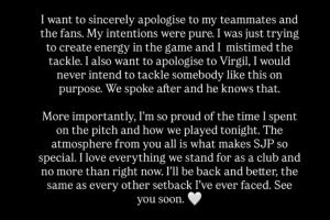 “我想要真诚地向我的队友和球迷们道歉。我的意图很单纯,我只是想在比赛中激发一些活力,但这次铲球时机把握得不好。我也要向范戴克道歉,我绝不会故意这样铲人。我们之后聊过,他知道这一点。