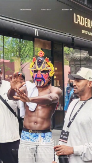 他戴着获赠的赵云戏剧面具在成都太古里逛街。