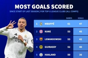 据德国转会市场统计,姆巴佩加盟皇马以来攻入47粒进球,五大联赛球员同期最多。