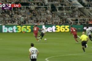 这一画面发生于第47分钟,当时利物浦多打一人2-0领先。纽卡反击,巴恩斯前插,科纳特补防,前者倒地,裁判未吹罚,VAR未介入,吉马良斯抗议判罚因此吃到黄牌。
