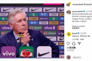 安切洛蒂社媒晒自己在新闻发布会中的照片,并写道:“我们的世界杯备战现在开始,我们希望以强大的实力、团结的精神、肩负着整个巴西的梦想出征世界杯,让我们一起加油!”