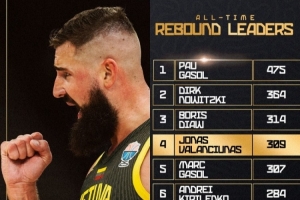 本场比赛,立陶宛球员瓦兰丘纳斯13投7中、罚球6中4,砍下全场最高的18分和9篮板,外加1助攻1盖帽。