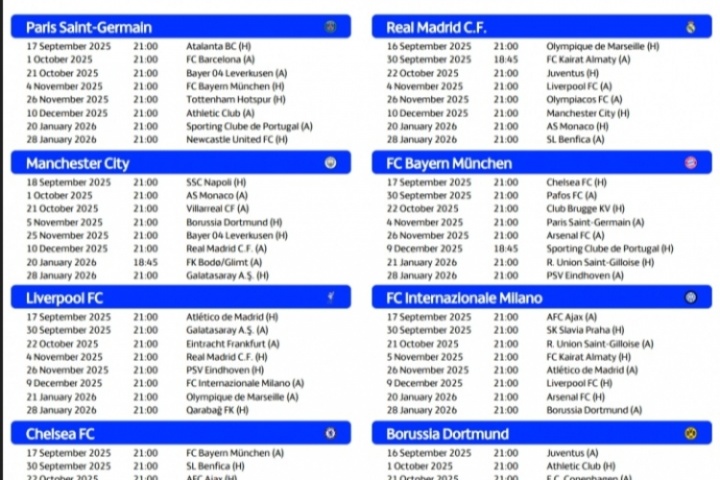 欧冠主要球队赛程:皇马10月1日远征哈萨克 巴萨10月2日大战巴黎