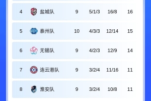 积分榜后三位分别为扬州积7分排名第11,常州队积5分排名第12,镇江队积3分排名倒数第一。