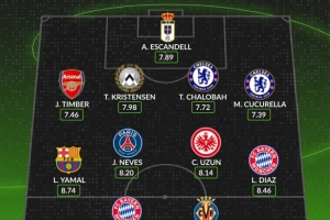 中场:亚马尔(巴萨,8.74分)、若奥-内维斯(巴黎,8.20分)、詹-乌尊(法兰克福,8.14分)、路易斯-迪亚斯(拜仁,8.46分)