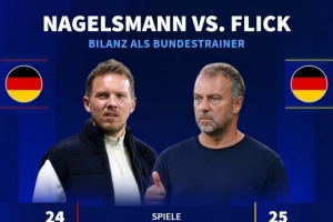 截止昨天的比赛,纳格尔斯曼已经执教德国队24场比赛,战绩为12胜6平6负20个净胜球。而弗里克从2021-2023年总计执教德国队25场,战绩为12胜7平6负30个净胜球。