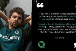 关于 “FLY训练赛敷衍,经常动不动就投降、甚至传言队员有裂痕”的话题,Bwipo解释称:队伍更重训练赛效率,无翻盘可能便不浪费时间,在美洲赛区我们队伍是心理素质最过硬的,逆风的时候我们拼的相当狠。如果有人想用训练赛来评价我们,那就赛场上见真章。