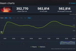 体育资讯9月6日讯 万众瞩目的类银河战士恶魔城游戏《空洞骑士:丝之歌》已于9月4日正式发售,根据SteamDB数据显示,截止今日10点,《丝之歌》在Steam平台的在线人数峰值再创新高,现已超越56万人!