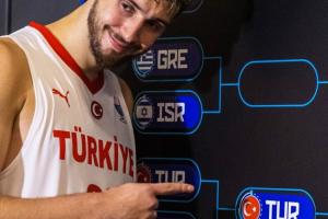 赛后在官方的晋级墙上,申京作为代表将把土耳其的队标贴到对应的8强席位上,申京开了个小玩笑,假动作直接就想把标贴向决赛的方向,最终还是老老实实地把队标贴到8强的位置。