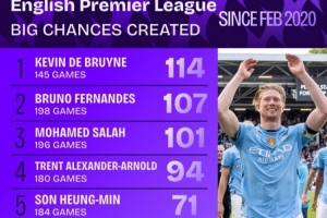 体育资讯9月7日讯 squakwa统计了自B费加盟曼联以来的英超同期创造重大机会情况,数据统计显示B费仅次于德布劳内。