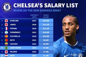 德转列切尔西队内薪资榜:斯特林居首,詹姆斯、福法纳列二三