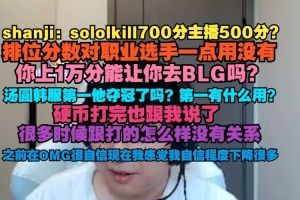 shanji:sololkill700分主播500分?排位分数对职业选手一点用没有,你上1万分能让你去BLG吗?汤圆韩服他夺冠了吗?第一有什么用?