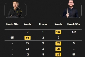 艾伦在上半场以3-1的比分进入中场休息,又一度以5-1拉开比分优势,第七局周跃龙单杆81分扳回一局,第八局艾伦几度上手完成超分,目前艾伦6-2领先周跃龙结束第一阶段。