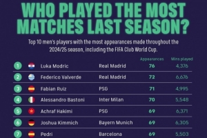 FIFPro晒上赛季球员出场榜:莫德里奇76场居首 巴尔韦德72场第二