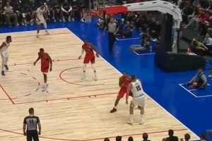 当时约基奇背打,转身之后底线一端单臂大抡传将球送给另一端的卡梅隆-约翰逊,但后者三分没能命中。