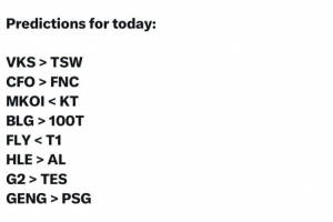 VKS战胜TSW、CFO战胜FNC、KT战胜MKOI、HLE战胜AL、BLG战胜100T、G2战胜TES、T1战胜FLY、GEN战胜PSG。