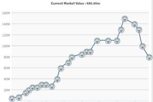 体育资讯10月17日讯 今日德转更新英超球员身价,25岁福登身价跌出亿元,目前为8000万欧,对比1年前1.5亿欧的身价已经腰斩。