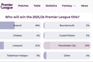 谁能夺冠?英超官网球迷投票:枪手44%第一,红军21%曼城14%