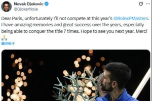 德约科维奇:“亲爱的巴黎,很遗憾今年我将无法参加劳力士大师赛。这些年来我在此留下了无数美好回忆并取得了辉煌战绩,尤其是七度加冕的珍贵时刻。期待明年再相逢。Merci(法语:感谢)”