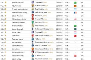 据估计,全球共有113名青少年球员身价至少达到1000万欧元,他们效力于25个联赛和80家俱乐部。 其中,英超联赛球员人数最多(23人),其次是德甲联赛(16人)和法甲联赛(11人)。