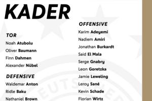 中前场:阿德耶米(多特)、阿米里(美因茨)、伯卡特(法兰克福)、马拉(科隆)、格纳布里(拜仁)、格雷茨卡(拜仁)、勒威林(斯图加特)、萨内(加拉塔萨雷)、沙德(布伦特福德)、维尔茨(利物浦)、沃尔特马德(纽卡)