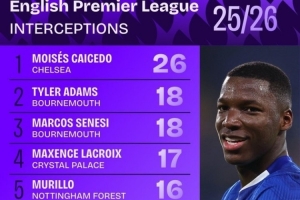 体育资讯11月11日讯 英超联赛已经进行了11轮,squakwa也统计了本赛季英超拦截次数情况,凯塞多独自领跑。