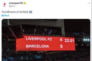 利物浦官推刚刚晒照回顾了那场比赛,但严格来说,2019年利物浦4-0翻盘巴萨的比赛是在当地时间5月7日进行的,即北京时间5月8日。