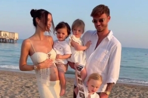 画面中,麦迪逊女友自豪地展示着她的孕肚,孩子们也亲吻了她的肚子。最后,麦迪逊在沙滩上写下“又是双胞胎”。