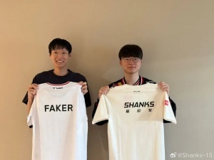体育资讯7月3日讯 今日MSI淘汰赛上,AL以3:1的比分击败FLY,赛后中单选手Shanks更博分享自己与Faker交换队服的合照。