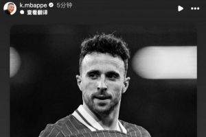 体育资讯7月3日讯 利物浦前锋若塔因车祸不幸离世,姆巴佩通过社媒晒照配文哀悼。