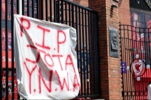 有利物浦球迷来到安菲尔德球场外,并挂上标语:安息吧若塔,你永不独行。