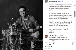 利物浦队长范迪克悼念若塔:我承诺我们会永远支持你的家人们